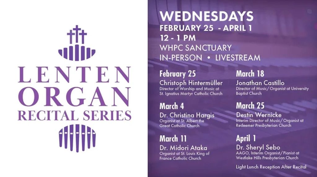 All are invited to attend Westlake Hills Presbyterian Church's Lenten Organ Recital Series every Wednesday during Lent. Each recital will feature an Organist from the Austin area. This six-week series is free and open to the public in-person and will be Live-streamed on the WHPC YouTube channel.