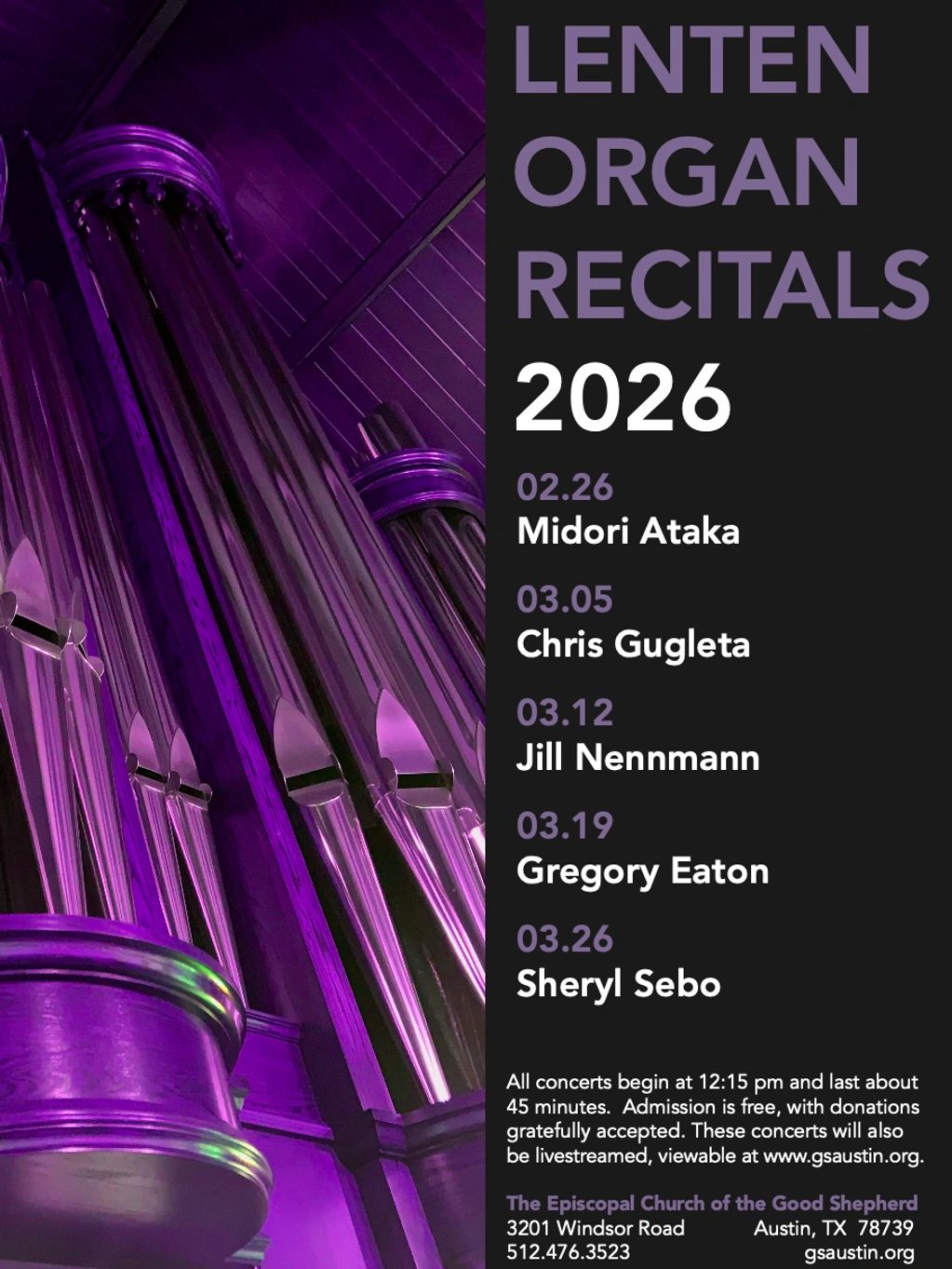 Episcopal Church of the Good Shepherd will offer 30-minute organ recitals on Thursdays in Lent, featuring fine organists from the Austin area. The concerts are free and open to the public, with donations gratefully accepted. The recitals will also be live-streamed on the GS website and Facebook page